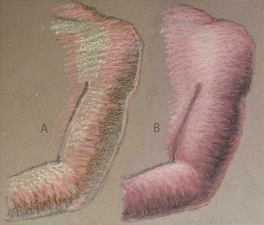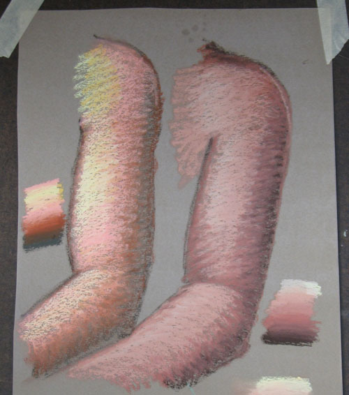 I wanted to compare a softer brand of oil pastels. The left is what I used for the last pose of the girl, Neopastels. At the right is Sennelier’s Oil Pastels. The Sennelier’s are only darker, because they’re the only colors I have at the moment. Senneliers blend more readily and look softer and fill more holes in the paper. For the purpose of rendering figures, that is what I want.
