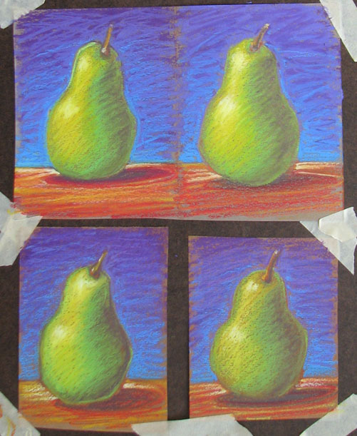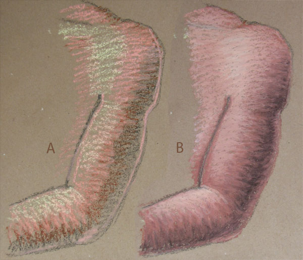 On this test I wanted to try soft on top of hard, to rough in with the Neopastels, and finish with the Sennelier’s. A is step 1, B is Step 2.