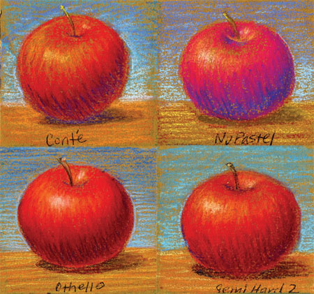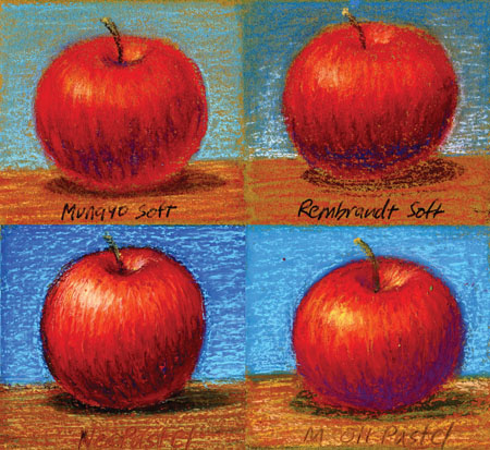 The Top two are the most popular Hard Pastels Cont’e Crayons and NuPastel. The NuPastel’s Red was more pinkish and the darks aren’t as dark. The Cont’e is more brilliant, less waxy. The Carbothello Pastel Pencils was the most brilliant, which surprised me because it’s the hardest, harder pastels contain more binders. Pencils are much easier to use too, sticks don’t always land on the paper where you expect. The Semi-hard would make a nice underpainting for soft pastel.