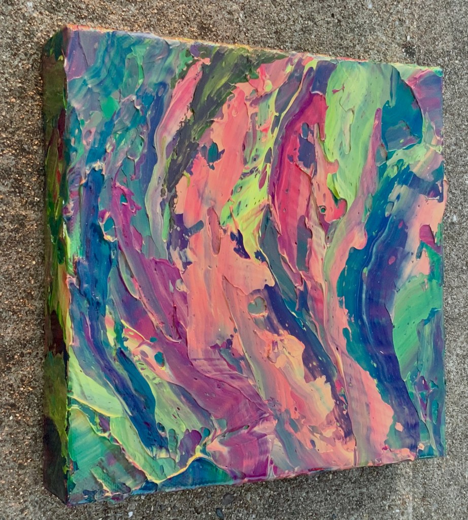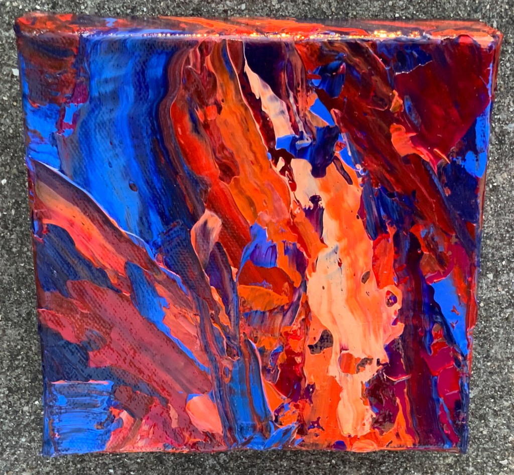 Here are my latest abstract explorations with Acrylic paint, palette knives and 6×6 and the last a 8×8 gallery wrap canvases.