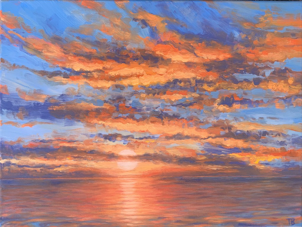 My husband Dave loved to watch the sunset over Lake Michigan. For over 30 years we returned to the lake in the summer, and watched in awe of the dramatic sky and peaceful rhythm of the waves. This time would be the last. The following winter, he passed away just before the pandemic took hold. While sheltering in place, it brought me peace to paint the bold color and fleeting light of time passing, remembering Dave’s life well lived.