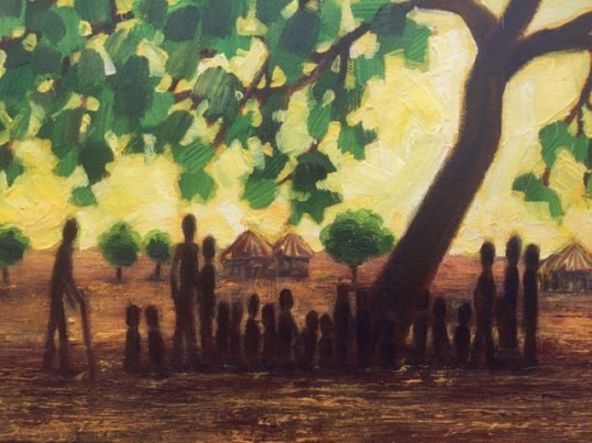 I finished “School Under the Trees” this afternoon. 12″x16″ acrylic on stretched canvas. Will be auctioned to help raise money to build a school in South Sudan.