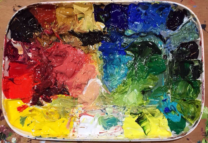 I noticed my palette is looking very juicy and colorful for my Lilly Pad paintings! I use Golden Open Acrylics and a Mijello Palette that seals. I can keep a palette going for a year or more if it gets regular use, refilling and maintenance. I don’t put water in the palette like other acrylics, that would be bad news! It’s the advantage of Golden Opens. The paint doesn’t skin over, it gets thicker, and impasto pasty gooey! That’s what I love! I was accustomed to oils and I use it the same way.